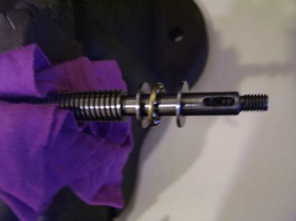 Fit thrust bearing to leadscrew taking care to place the face of the flat race parts of the bearings with the ball groove in them against the cage carrying the steel ball bearings and pack with grease. See photo 3 below.