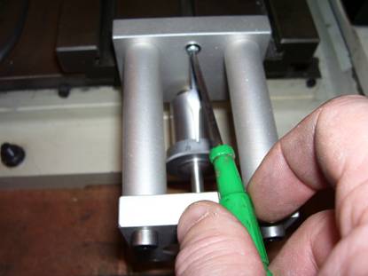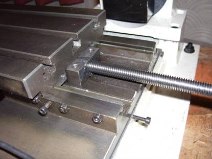 By turning the leadscrew adaptor screw the table along right up to the leadscrew nut as far as it will go then back it off a couple of turns. At this point any misalignment will be at its worst condition. See Photo 13 below.