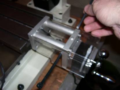 When the table mounting plate is near the edge of the machine bed slide the table up to the table mounting plate and fit the M6 cap screws. Tighten the screws up and then slack them off slightly to allow the plate to move slightly. See photo 12 below.