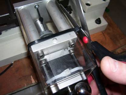 Very carefully remove the machine dial from the Original machine handle. As you slide the dial off a spring clip will pop out so hold your hand around the handle assembly while sliding the machine dial off the handle. Now fit the machine dial and spring clip to the leadscrew adaptor. See photo 15 below.